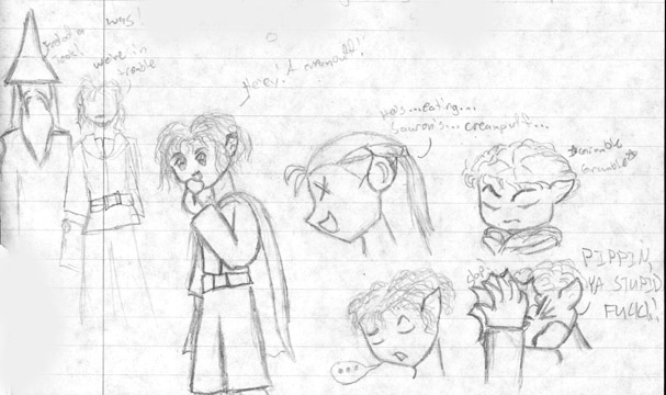 | I love this doodle!! This spawned from an idea by Misti after I succumbed to my creampuff fetish, saying that they were calling to me CAN YOU HEAR THEM??? Uh, anyway, we joked that creampuffs were like the One Ring, and we came up with a little idea that what if instead of the One Ring, Sauron had a One Creampuff? And the Fellowship was on a quest to destroy it and on the way to Mordor Pippin ate it? Think about it ^^. *If you can't read what they're all saying, here's the "script": from left to right: Gandalf: Fool of a Took! Aragorn: *yes, that's Aragorn* We're in trouble... Pippin: He'ey! A creampuff!! Legolas: He's...eating...Sauron's...Creampuff... Sam: *grumble grumble* Frodo: ... Merry: *slapping is forehead* PIPPIN, YA STUPID FUCK!! |