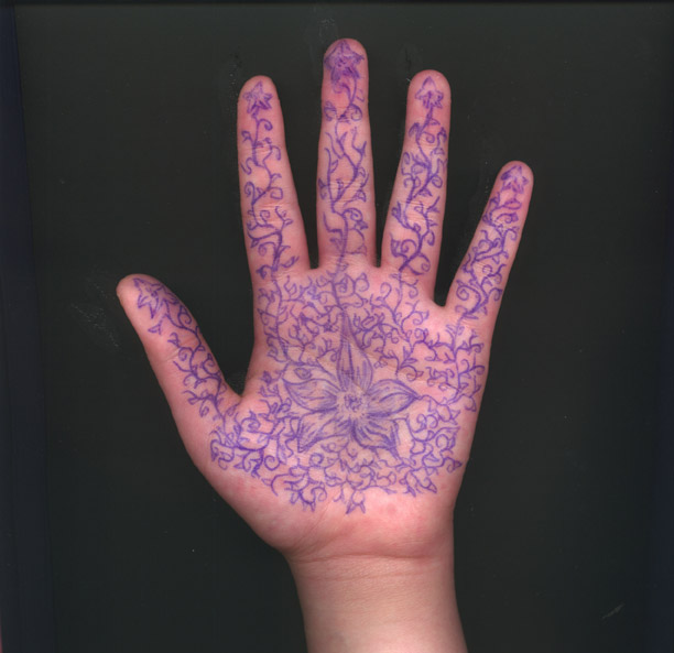 | After we finished notes one day in History we had the rest of the period to ourselves. I had my pen out and my hand looked really plain, so I started doodling on it. It actually took me the rest of that period and most of the period after to finish, but I think it looks pretty cool. Everybody else thought so too ^^ |
