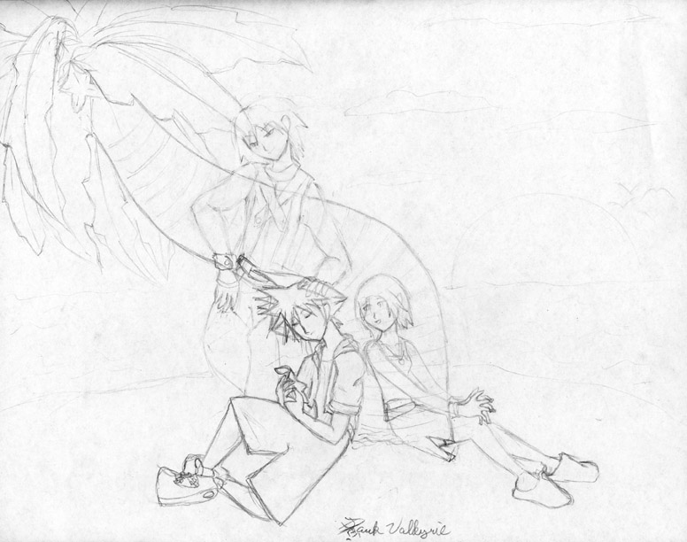 | Don't ask how he got back on the island, I don't know. I drew this picture because of some inspiration due to that little poem on the Kingdom Hearts trailer. It's Sora holding a paopu fruit under the tree they used to hang out at, remembering his lost friends. Riku and Kairi look all transparent-ish because they're there in spirit, and so their images are insubstantial. I want to do a drawing like this of the Wiggins in an excerpt from Shadowpuppets, but this will suffice for my angsty side for now. I plan to re-draw this with charcoals on a large paper and watercolor it someday, because that would make it look so very pretty, don't you agree? |
