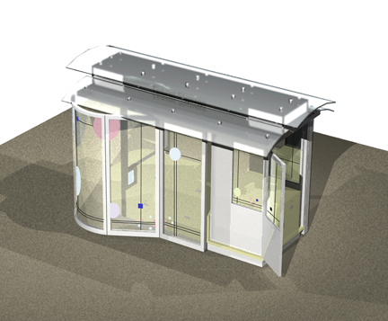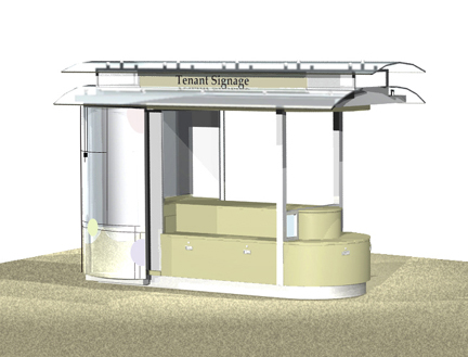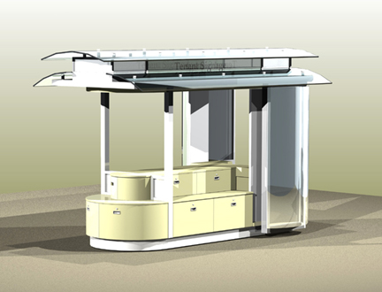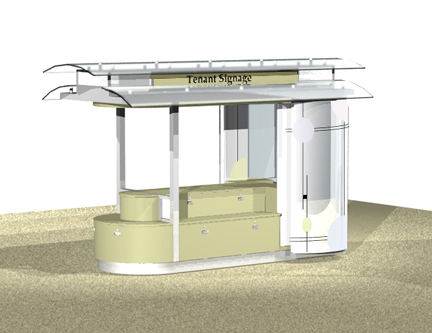 | Shopping centre Kiosk This kiosk was designed to be located outside of a shopping center. It features glass panels that can be retracted during the day and closed and locked in the evening. The glass panels have a Frank Loyd Wright inspired motif applied to the glass in the style of his stained glass windows. |