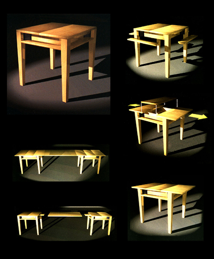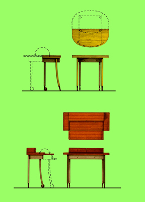 | Office table system: with extra top suspended between existing tops using "swing-out" leg | |||||||||||||||||||||||||||||||||||||||||||||