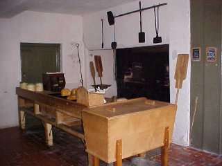 Saws hang on walls of the pit where timber was cut into manageable widths, the tools in the blacksmith's shop are the very ones that were used to repair the fine eighteenth-century ironwork screen in the formal garden, and the dry laundry sports a mangle in which clothes were pressed using the weight of a box of stones. |