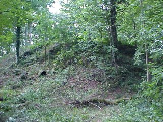 Although now covered with trees and vegetation, this area is being cleared to show the commanding position this castle had over the surrounding area. This is one of the finest examples of a Motte and Bailey in this area. |