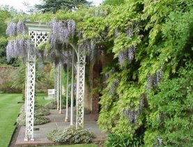 during the later years of his life. He commissioned two equestrian wire sculptures by Christopher Hobbs and a metal pergola by Philip Jebb. There is a wide variety of climbing plants on the walls for late spring and summer effect. |