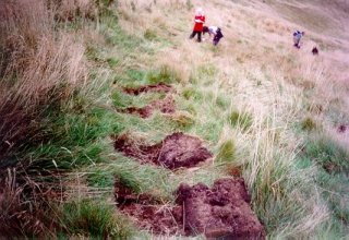Turfs were dug out on three sides about 24insx18ins in size and the grass was laid back to expose the bare soil. Heather seed pods and separated heather seeds were then spread over the area. |