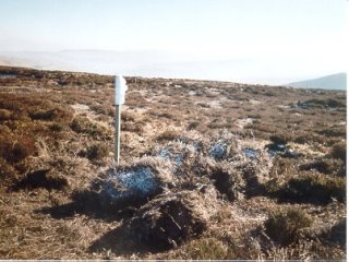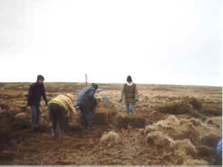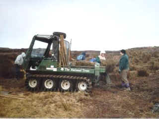 Bales of Heather are harvested from moorland areas rich in Heather and stored for a few months to dry out so that the seed bearing pods are ready to drop off. The bales are then brought to the exposed areas of the moor and the Heather is spread out on top of the bare peat to a depth of about two inches. Flag markers were left on the moor to make the bales easier to locate. |