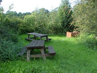 some picnic tables and a brick barbecue.