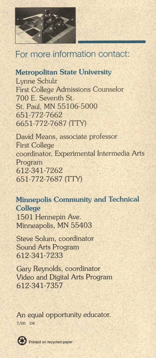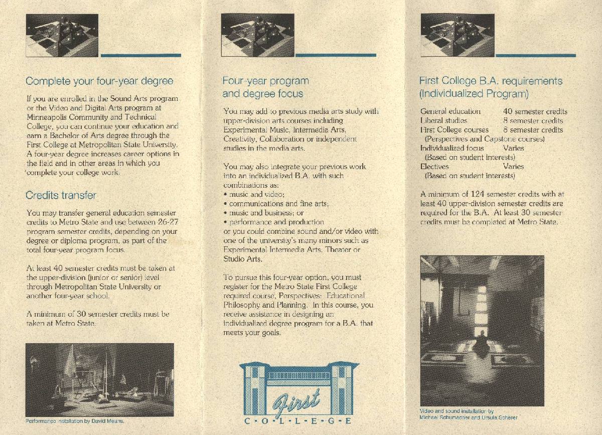 | Articulation Program Between First College and Sound Arts and Video and Digital Arts Program Minneapolis Community and Technical College (Click here for contact information.) |