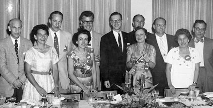 Bob Apple, 10th Pres., Eudora Hendricks, 6th Pres., Bob Pinker, 5th Pres & IHAA Pres., Jerry Prime, 19th Pres. unidentified, Roger Lane, 4th Pres.Yoel Eisen, First Pres. unidentified, Marty Berman, 3rd Pres. unidentified, Jess Levy, Charter Member. This meeting preceded the International which was formed a year to two later when Texas, New York, South Florida and a few other local chapters formed the International Hotel Accountants Association and elected their first President Fitzsimmons. |