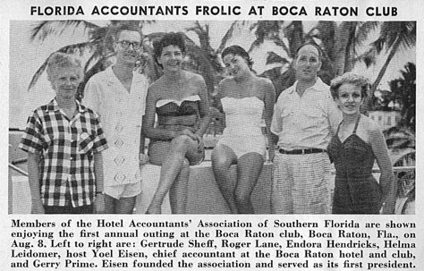 First Summer Outing - August 6,1953 - Boca Raton Beach Club The early years were very active in keeping with the growth and expansion of the hotels along Collins Avenue, all the way up to Bal Harbour and the motels eventually built on the Sunny Isles strip. Prior to the 50's all the hotels closed for the summer. The new hotels now stayed open all summer, offering $7. a day rooms to summer visitors (secretaries from New York) and a dollar extra for breakfast. Rooms on South Beach rented in the summer for as low a $1. or $2. a night. No one at first had air conditioning. Then window shakers were installed in the older properties. As new resorts were built, they all had central air- conditioning and did convention business in the off-season along with tourists. This was the period of 'This Year's Hotel', the Algiers, the Casablanca, the Americana, the Fontainebleau, the Eden Roc, the Carillon and the Balmoral. Each property had a Controller (the term now used for the head of the accounting Department) for hotels of 200 rooms or greater. The older and small places still had their "Auditors". With the new larger hotels having a half dozen accounting office staffers, our association expanded to include them; Assistant Controllers, General Cashiers like Walter Vorack of the Fontainebleau, our 14th President, and Paymasters (payrolls were done all by hand and eventually by NCR accounting machines). Twelve dinner meetings a year would be held at one of the member hotels; with each trying to out do the other with outstanding food presentation (all bookkeeping done at steward sales, as we knew how to keep the cost low). An industry speaker would put on an Educational Talk. The dinner was always preceded with an open bar Social Hour. The success of the association was based to two things; the employer paid the dues and in many cases the dinner fees and more important the NETWORKING aspect of getting together each month and knowing your fellow hotel accountant. When I opened the "original" Diplomat Resort and Country Club in 1958, I came from the Kenilworth Hotel, of Arthur Godfrey fame; where I had a winter season only assistant. At the "Dip", I staffed almost my whole accounting department through people I knew from the Hotel Accountants Association of South Florida. Robert Pinker, Golden Gate Resort, local 5th President, became our first International President and we held our first International Convention at the Americana (now the Sheridan) at Bal Harbour. Several of my assistants became Chapter Presidents; Ray Witkowski 1964, Sal Spano 1974, Denise Perman 1980 and Doug McFarland in 1984. Our second International President was Tom Moore. He was Chapter President 1966/1967. Our next two, both from the Diplomat Hotel, International President Sal Spano, International President Doug McFarland and later International President Len Bartello 1987 represented our local chapter. South Florida gave the International two other Presidents who had moved on before their inauguration Rene Morato and Arlene Phelan, both of which served as local Presidents. These were the heady days for the hotel business on Miami Beach and some of the greatest years for the Hotel Accountants Association of South Florida. Our members to the north from Ft. Lauderdale all the way up the Palm Beach, formed a new chapter - Gold Coast and even later, further north, the Treasure Coast Chapter was formed. HITEC was conceived at Texas 30 years ago. Sal Spano and I invited the second tech meeting to be held at the Diplomat, which was a great success. The next four annual Tech exhibit meeting were also held at the Diplomat in Hollywood. By this time HITEC had out grown us and needed to move around the country. Computers were a must in hotel accounting departments and were rapidly being installed in larger properties as on-line systems. Following the 6th HITEC held at the Diplomat, NCR invited me to inspect their new on-line property management system HOST, recently installed at the Hyatt in New Orleans. The system was soon ordered and we became the first local successful on-line property in South Florida. Both the local and the International have had to change their names several times, to keep up with the industry and now include the technical side of our profession as Hospitality Financial and Technology Professionals. The International honored me in June 2002 with their first HFTP Technology Award of Merit during their 30th anniversary HITEC convention in Chicago. Fifteen years earlier the South Florida Chapter presented me with a Life Membership. In June of Year 2004, the Association celebrated their 50th Anniversary at the New Diplomat Resort on Hollywood Beach. The classic Diplomat was well represented. |