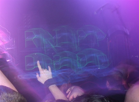 Whilst waiting for Fear Factory to come on, I did happen to notice that the Marshall stracks on stage were painted with the letters "RIP DBD" in bright green, a touching tribute to the great man that the lads in Fear Factory no doubt had enjoyed a personal relationship with (see photo, it's blurry but you can make out the letters).