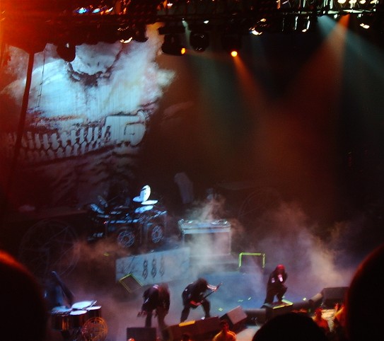 Record sales figures and music industry marketing saw to it that this evening the learners would take the stage after the masters. And so it was, after the pre-recorded intro of "Prelude", Slipknot arrived, kicking into "Blister Exits" with the ferocity of a pack of pissed off bulls. From Vol 3: The Subliminal Verses we were also treated to "Three Nil", "Duality" and "Vermillion". But it was the classics that really fired up the crowd, including "Eyeless", "Wait and Bleed", "The Heretic Anthem", "Spit It Out" and "People Equal Shit". All of this made up for a very entertaining and energetic set. I did think at times the sound let them down though. Music of this intensity does require a cleaner mix from the board, which Slayer did have. Perhaps it's much more difficult to mix nine instruments down than four... Despite this, the "maggots" got down into a frenzy to the Slipknot sound, and no one was left disappointed.
