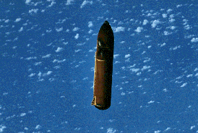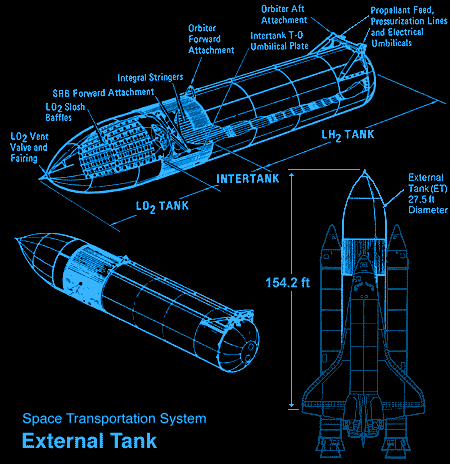 Updated: May 26, 2007 Webmaster: Richard Kalie |  | External Tank (ET)  The External Tank (ET) is 154.2 feet (47 meters) long and has a diameter of 27.5 feet (8.37 meters). The External Tank is the rust colored piece of the STS and it is the largest component that comprises the Shuttle Transportation System (STS); the rust colored material is actually one inch of insulated foam (poly-iso-cyanate). In fact, the ET used to be painted white, however, it was discovered that hundreds of pounds of weight savings would be achieved if the paint was not applied. The ET contains liquid hydrogen fuel and liquid oxidizer and puts them under pressure to the Orbiter's three main engines during the launch and ascent phases. The ET holds 143,000 gallons (540,000 liters) of liquid oxygen in its smaller upper tank and it holds 383,000 gallons (1.5 million liters) of liquid hydrogen in its larger lower tank. The ET is the only piece on the STS that is not reused and it burns up in the atmosphere when it is jettisoned from the Orbiter. It is the heaviest component and contains the most fuel. The External Tank has to be really strong due to the weight and stress that the Solid Rocket Boosters and the Orbiter put on it during launch and ascent. Therefore, the External Tank acts as the backbone for the entire assembly.
