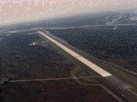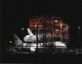 Orbiter landings at the Kennedy Space Center are made on one of the largest runways in the world. The runway is located 3.2 km (2 miles) northwest of the Vehicle Assembly Building and is 4,572 meters (15,000ft) long and 91.4 meters (300ft) wide - about as wide as the length of a football field. It has 305 meters (1000ft) of paved overruns at each end and the paving thickness is 40.6cm (15 inches) at the center. The facility includes a 150 x 168 meter (490x550ft) parking apron and a 3.2 km (2 mile) tow-way connecting it with the Orbiter Processing Facility . Located adjacent to the parking apron is a Landing Aids Control Building (LACB) which supports landing operations and houses operations personnel. Located at the northeast corner of the parking apron is the Mate/De-Mate device (MDD) used to raise and lower the orbiter from its 747 carrier aircraft during ferry operations. The open-truss steel structure is equipped with hoists, adapters and movable platforms for access to certain orbiter components and equipment. It also is equipped with lightning protection devices. The MDD is 45.7 meters (150ft) long, 28.3 meters (93ft) wide and 32 meters (105ft) high. The Shuttle Landing Facility is equipped with a number of navigation and landing aids to assist Shuttle pilots in landing. There are four sophisticated Microwave Scanning Beam Landing System (MSBLS) ground stations - two located at each end of the runway - that provide elevation and directional/distance measurement for landing approaches from the northwest (runway 15) or southeast (runway 33). Equipment onboard the orbiter receives the data from the MSBLS stations and automatically makes any needed adjustments to the glide slope. A Tactical Air Navigation (TACAN) system, located at mid-field off the east side of the runway, is used by pilots to execute an instrument landing approach to the runway. The TACAN has a range of 483 kilometers (300 miles), and is received by the orbiter when it emerges from the reentry blackout period. The final approach is guided by the MSBLS system. Visual aids are provided by Precision Approach Path Indicators, known as the PAPI system. They utilize arrays of red and white lights that, when lined up properly by the pilot, will indicate the proper glide slope. A ball/bar light system is used for inner glide slope information on final approach - to inform the pilot whether he is on, above or below the glide slope for an orbiter touchdown point marked on the runway. A Recovery Convoy Staging Area, located just east of the runway about midway along its length, houses trailers, mobile units and specially designed vehicles that are used to "safe" the orbiter immediately after landing for crew egress and transfer of the orbiter to the Orbiter Processing Facility. A specially constructed earthen mound just east of the Convoy Staging Area contains bleachers, press facilities and a Public Affairs control room to support invited guests and press coverage during orbiter landings at the Kennedy Space Center.