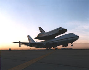 Construction of the MDD was completed in late 1976. It was first used during mate-demate operations with the prototype orbiter Enterprise during the Approach and Landing Tests (ALT) in 1977. It has been used for all post-landing and SCA mating operations at Dryden since the ALT program. The facility consists of two 100-foot towers with stationary work platforms at the 20 40 60 and 80-foot levels on each tower and a horizontal structure mounted at the 80-foot level between the two towers. The horizontal unit cantilevers 70 feet out from the main tower units and controls and guides a large lift beam that attaches to the orbiters to raise and lower them. Three large hoists are used to raise and lower the lift beam. Two of the hoists are connected to the aft portion of the lift beam and one hoist is attached to the beam's forward section. The three hoists operate simultaneously in the hoisting process. Each of the three hoists has a 100,000-pound lift capability. Operating together, the total lifting capacity of the three units is 240,000 pounds (120 tons). During orbiter turnaround operations, two access platforms for orbiter servicing specialists are positioned on each side of the orbiter after it is towed into the MDD. The platforms are normally stored at the 60-foot level when not in use. During servicing operations the platforms are lowered on each side of the orbiter by a pair of telescoping tubes extending down from the cantilever section. Two equipment hoists, each capable of lifting 10,000 pounds are also built into each tower. These hoists operate up to the 60-foot level of the MDD. Connell Associates Inc., Coral Gables, Fla. designed the MDD. It was constructed in 1976 by the George A. Fuller Co., Chicago, Ill., at a cost of $1.7 million. The Space Shuttle hangar, near the MDD, is a single-bay 25,000 square-foot structure 170 feet deep, 140 feet wide and 80 feet high. A 6,700 square-foot annex on the north side of the hangar building is used for administrative offices, ground operations control room and a joint-use shop area. Inside the hangar, two overhead bridge cranes provide lift capability for orbiter (or aircraft) servicing and maintenance operations. Each crane has a lift capability of 50,000 pounds. Voorheis, Trindle and Nelson (VTN), Irvine, Calif. Built the hangar. It was built by Santa Fe Engineers Inc., Lancaster, Calif., at a cost of $3.7 million. Construction was completed in early 1976. A concrete tow-way, 60 feet wide and 15 inches thick, connects the MDD and the Space Shuttle hangar with the aircraft ramp at the main Dryden complex, and with the taxiway extending onto the Edwards Air Force Base flightline and runway network. Shuttle Carrier Aircraft NASA uses two modified Boeing 747 jetliners, originally manufactured for commercial use, as Space Shuttle Carrier Aircraft (SCA). One is a 747-100 model, while the other is designated a 747-100SR (short range). The two aircraft are identical in appearance and in their performance as Shuttle Carrier Aircraft.