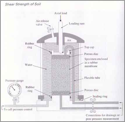 The triaxial shear test is one of the most reliable methods available for determining shear strength parameters. It is widely used for research and conventional testing. A diagram of the triaxial test layout is show in Figure 7.
