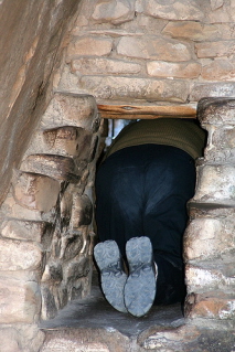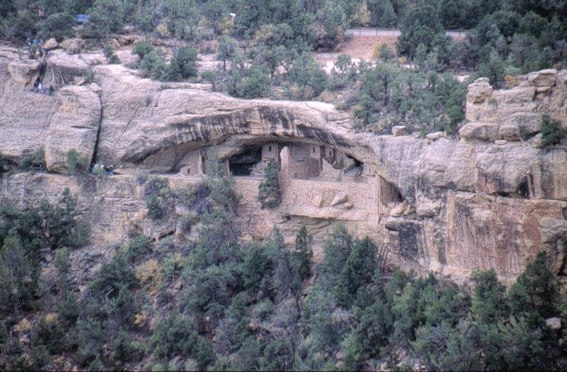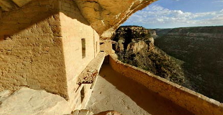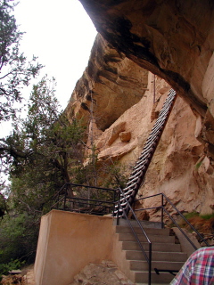 | Balcony House is difficult to get to. Climbing ladders and going through a narrow tunnel is the only way. The natural defense and a seep spring might explain why it is thought that Balcony House was the last occupied cliff dwelling. If you click on the photo above you are better able to see people climbing out of Balcony House in the left section of the photo. |
