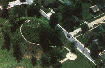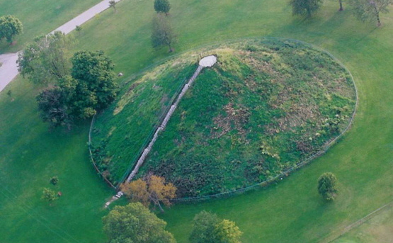 | An overhead shot of Miamisburg Mound. This mound is next to a golf course. Rather being swallowed by the golf course, the mound has separate access and is fenced off. Kudos for doing the right thing, and giving the golfers a great view at the same time. |