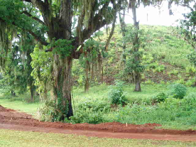 | A view of the Temple Mound behind some Spanish Moss at Kolomoki. |