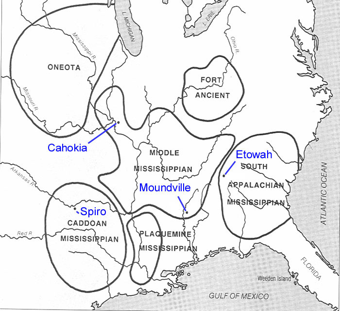 The Mississippian culture lasted from before 800 A.D. to after 1500 A.D. The four major sites were in Illinois (Cahokia), Georgia (Etowah), Alabama (Moundville) and Oklahoma (Spiro). Cahokia was the largest and most populous of the four major Mississippian sites. Trading is documented between the sites which all coexisted at the same time. Ultimately, all the major Mississippian sites were abandoned. Each site may have had different reasons for declining. Warfare, poor soil and water conservation, the little ice age, and my personal favorite: political turmoil. Political turmoil may have been fostered by social inequality and inherited positions of power. Could it be that the common man, after being offered safety and food, got tired of turning over his crops and building mounds that were not truly his? Longing for freedom, he may have left and taken his chances in small settlements. Lessons to be learned for all of us. |