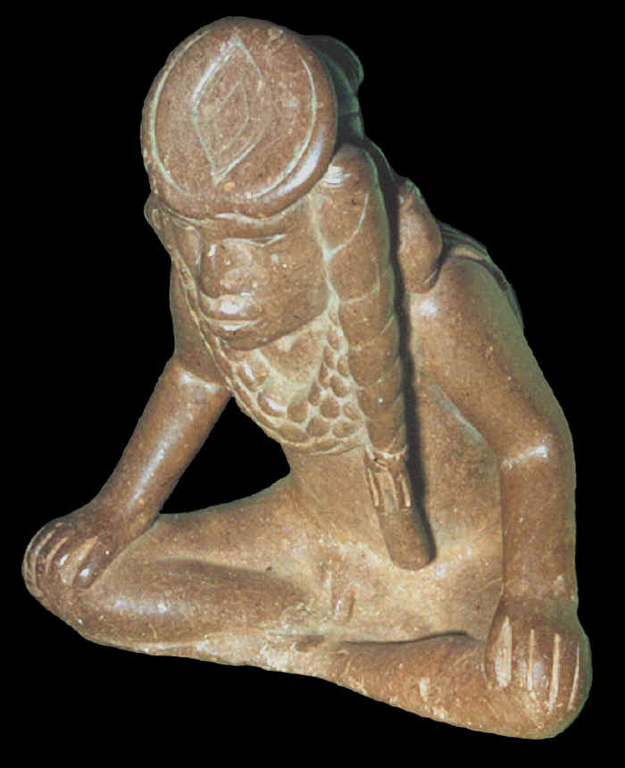 | This picture shows the front view of the "Resting Warrior" pipe from Spiro. Visible features include multiple strands of shell beads around the neck and one of the two large human maskette ear ornaments. An impressive headdress with an ogee design and a long single strand of braided hair have also been skillfully carved into the pipe. This human figure is leaning forward in a cross-legged posture and has strong facial features. This pipe is made of flint clay or fire clay. 11 inches high and 9 inches wide with a weight of 11 lbs. and 8 oz. I personally consider this to be the signature artifact of Spiro. |