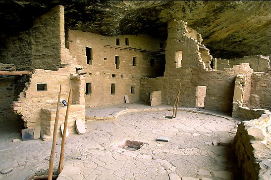 | Spruce Tree House has two kivas with restored roofs (based on an intact kiva roof at Square Tower House). The ladders are the entrances to the kivas. . . |