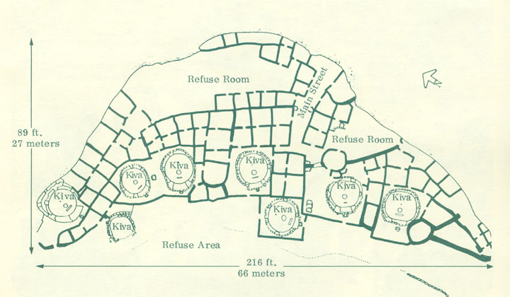| A diagram showing the 114 rooms and 8 Kivas of Spruce Tree House. |