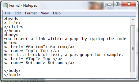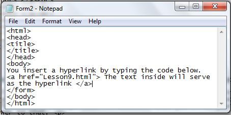 This lesson tackles about hyperlink and links within a page. Before we start, you should need to know what is a hyperlink, first. A hyperlink is a text and when you click that text, it will redirect you to another page. Notice that hyperlinks in the past chapters? I commonly used "here" and when you clicked it, you go into another html. That is also the concept I used in the tabs home, tutorials, excercises and about us above. That is also the concept used in Facebook, when you click your friend's name and you go into his/her profile, hyperlink is the answer to that. Here is the code how.
