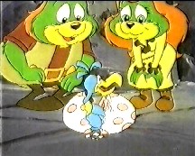 The Urpney's also arrive at the Jolly Bird's nest, which is resting on top of the mineral that the Urpney's are looking for. Blob tells the Jolly Bird to get off the nest, but she tells them to push off as she isn't leaving in it. The Urpney's decide to distract the Jolly Bird so Frizz taunts the Jolly Bird and it chases him off, while Blob and Nug go to nest and chop a piece of mineral off. Just before they chop the mineral, Nug throws an egg out of the nest which Rufus manages to catch. The Jolly Bird arrives back carrying Frizz in her beak, but drops him when she notices her egg is missing. The three Urpney's run off, with the Jolly Bird in pursuit of them. Rufus and Amberley come out from behind the rock with the egg and it hatches in front of them. Rufus goes after the Jolly Bird to tell her that her egg is safe and it has hatched. Rufus soon arrives back with the Jolly Bird and she thanks them for saving her baby. Spildit also cheers up when the baby Jolly bird thanks her for saving her.