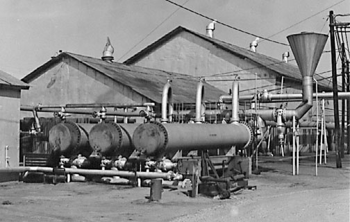 First things first, when you pump oil, it has to be heated so as to lower the viscosity and make pumping easier to flow through the pipeline. The three tanks lying on their sides are Heat Exchangers. Exhaust steam from the Pipeline Pumps (in the building behind), is used to heat the the oil flowing through the Heat Exchangers to the Pipeline Pumps. The last use of the steam is to transfer its heat to the oil inside the Exchanger before returning to water in the boilers.
