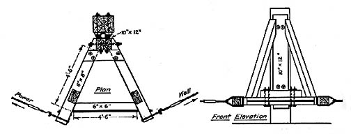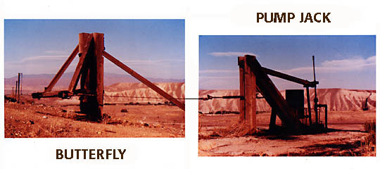 Seen on the left photo is the Shackle Line on hold-up post coming to the Butterfly used for changing the direction of the Shackle Line going to a Wooden Triangular Pump Jack at the right. This type of technology over the years developed many tupes of Pump Jacks designs and methods to get the Shackle Lines to them.