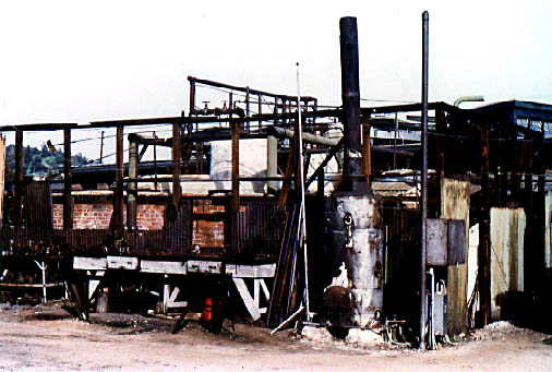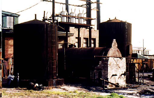 Steam was used to heat oil and operate steam pumps moving the oil from tank to tank. Here is a small vertical boiler seen at the right of the work bench, behind are several large steam boilers.