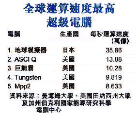 - 根據德國曼海姆大學、美國田納西州大學及加州伯克利國家能源研究科學電腦中心最新報告指出,現時全球運行速度最快的超級電腦,是由日本NEC製造的「地球模擬器」(Earth Simulator),其運行速度達每秒35.86萬億次,配備有5,120個中央處理器。「地球模擬器」主要用作氣候研究,由於可以輸入複雜的變數,加上模擬逼真,所以它計算出來的預測值都極度準確,連美國能源部也表示它令美國的氣候研究落後了10至100倍。
