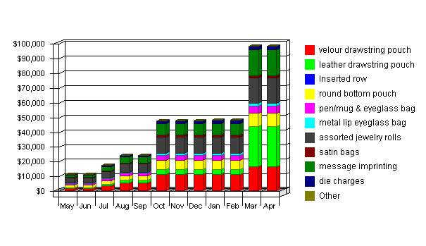 Sales in the advertising specialties industry have been growing at a rate of almost 7% per year since 1988 and reached over $7 billion in sales last year. Within that industry, the three suppliers that offer only velour and leatherette drawstring bags did a combined $2,500,000 in sales. Those three suppliers are located on the East Coast while some of largest advertising specialty distributors in the industry are Midwest and West Coast firms. We feel that by concentrating our efforts on marketing to the West Coast distributors, many of which already have had positive business relationships with our personnel, we will acquire a significant market share of the packaging niche over the next three years.