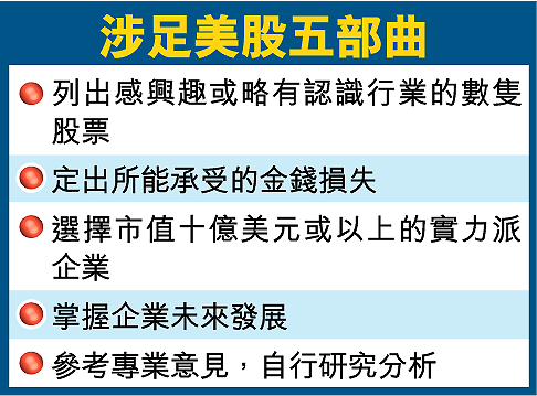 在 揀 選 股 票 時 , 初 次 接 觸 美 股 的 投 資 者 可 就 本 身 感 興 趣 或 略 有 認 識 的 行 業 列 出 相 關 股 票 , 然 後 再 從 中 作 出 選 擇 。 投 資 者 可 以 參 考 一 些 知 名 財 經 網 站 提 供 的 實 用 資 料 , 例 如 Yahoo! Finance 及 Bloomberg.com 等 。 此 外 , 一 些 美 國 證 券 公 司 如 嘉 信 理 財 亦 有 提 供 網 上 工 具 , 協 助 客 戶 揀 選 股 票 。