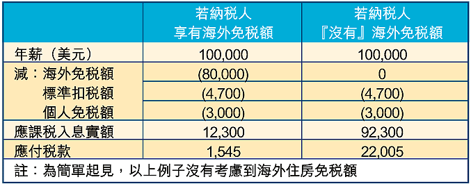 從 該 例 子 大 家 可 見 到 ,海 外 免 稅 額 對 美 國 納 稅 人 的 影 響 可 真 不 少 。如 果 上 述 的 美 國 人 士 不 是 在 海 外 工 作 和 居 住 ,他 就 必 須 就 其 全 部 10 萬 美 元 薪 金 繳 付 美 國 個 人 入 息 稅 。 由 此 可 見 ,工 作 和 居 住 於 海 外 的 美 國 人 士 ,的 確 能 享 有 某 些 稅 務 方 面 的 優 惠 ,反 映 了 美 國 政 府 鼓 勵 國 民 到 海 外 工 作 的 政 策 。因 此 ,若 參 眾 兩 院 取 消 海 外 免 稅 額 ,除 了 加 重 海 外 美 國 人 士 之 稅 務 負 擔 外 ,亦 可 能 會 打 擊 海 外 工 作 人 士 的 信 心 ,從 而 影 響 美 國 在 海 外 的 投 資 。 再 者 ,由 於 現 時 很 多 僱 主 都 為 其 僱 員 提 供 「 稅 額 負 擔 的 平 衡 」或 「 稅 額 負 擔 的 保 障 」 ,取 消 海 外 免 稅 額 也 間 接 增 加 僱 主 的 經 營 成 本 。
