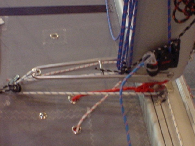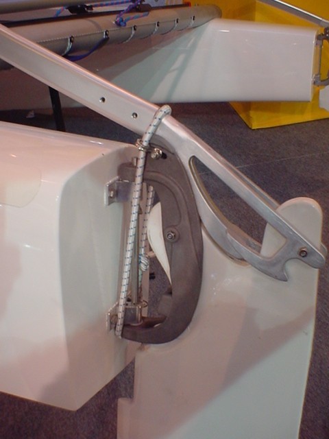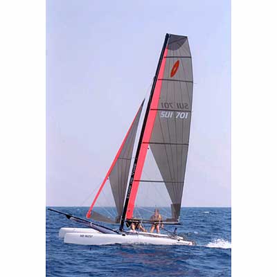 | The boat yards of Ventilo and Mattia have jointly developped a new hull design. This planing hull design with a trip turbulator right behind the daggerboard is now featured on two new 5.0 mtr. (16,4 foot) designs which have been simultaniously launched in the year 2002. Both designs use the same platform, beams and a boomless mainsail of equal area. But than both companies go their own way and offer different rig packages and also the fittings differ slightly. Some of the more striking differences are : Ventilo uses T-foil rudders while Mattia fits its boats with their conventional kick up rudders Ventilo uses a rail and traveller car on the mainsail foot a la Nacra and Mattia uses a clew plate with holes Ventilo uses a swiveling gennaker cleat fitted in the middle of the trampoline and Mattia has a cleat fitted higher up on the mast. Ventilo offers a carbon mast as an option. Ventilo offers a circular selftacking jib track as an option and Mattia fits a straight selftacking jib track as a standard fitting. The Ventilo bridle intersection sits a little lower on the platform and the jib is cut a little taller and uses asymmetric daggerboards. But both designs use mylar sails again. See the pictures below to spot the smaller differences. |