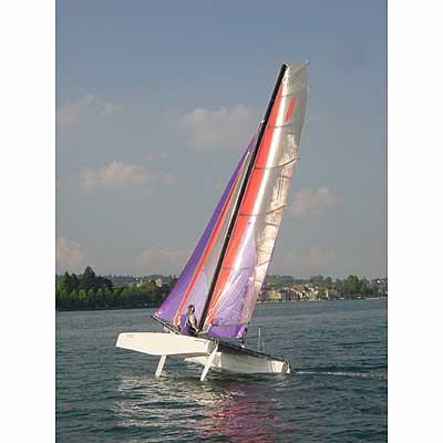 From the Ventilo prospect / leaflet (Thanks Steve Zehnder) The Name is ventilo Zipo 16 or, as Ventilo currently presents it, Ventilo Zip'O Lenght 5 meter Width 2,5 meters Weight 120 kg Mast 8,0 meters (carbon) Mainsail 14,0 sq. mtr. Jib 3,7 sq. mtr. Spi 17 sq. mtr The design looks to be fully compliant with the current Formula 16 rules Prospective Texel rating = 106 = 4 % slower than F18 at 102. |