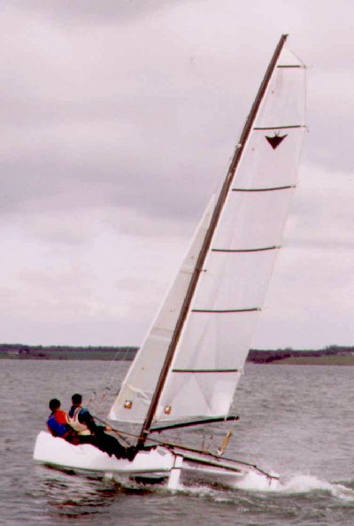 | Relatively little was known to us about the Stealth or the company building this cat. But it is certainly making a rapid rise up the ranks. The BIM F16 and Taipan 4.9 were in first but the Stealth looks like it has got its eyes set on becoming the F16 HP wapon of choice. The design is fairly recent (1996) and the boats were designed to be sailed with a genaker from the beginning. A definate plus. Furthermore, its designers are continuing to finetune the Stealth as to get it's performance as close to the F18 as possible. It is claimed that the boat has a handicap difference with the F18 of only 1% with the new jib setup. This little boat has been beating F18's and picking at some heels of iF20 designs in the UK this year. It was sailed by a very capable (ex-tornado) crew, that must be said, but even an ex-tornado crew can not perform miracles. The performance basis must be there. The grandfathered Stealth R has won two out of four UKCRA championship races and thus won the 2001 UKCRA championship. The Stealth is 5.03 meters long and is, therefore, in conflict with the F16 HP rules (it is 0,03 meters too long). But it has been decided to allow this as a grandfathered boat. Apart from this it is fully compliant and can also be sailed solo just like the Taipan 4.9 an Bim 16. This, and the fact that the designers are already getting it up to F18 speed, will make this boat a good (grandfathered) edition into the F16 HP class. The boat has a carbon mast by Holland Composites and is built by Dave Ovington (who is a well known builder of Lasers, 49-ers, 29-ers and the Musto skiff). The Stealth is an English designed and built catamaran made by vacuum bagging fibre mats and epoxy resin. It's design is continiously being improved and the designers are fully involved in the setup of the F16HP. They have also indicated that they can get quite near to the F16HP minimum weight of 100 kg's with their Stealth design on a production basis. Latest news : Stealth marine has just announced their new redesigned Stealth F16, it will be fully optimized under the F16 HP rules and will have a higher (8,5 mtr) tapered carbon mast and larger F16 HP sails. It's weight will be right at the F16 HP minimum of 100 kg's (2-up mode). This new Stealth F16 is therefor a pure F16 HP. This Stealth is fully compliant and doesn't have to be grandfathered in ofcourse. For more information on this boat go to : www.geocities.com/stealthmarine2002/ (page dedicated to new Stealth F16) www.stealthmarine.co.uk The specifications of the non-F16 HP stealth are ( source ; www.knwv.texelrating.nl) : Platform length : 5,03 mtr. (Texel measurement) width : 2,29 mtr. weight : 117 kg (Texel measurement, ISAF 109 kg's, designers : 100 kg's in reach) mast height : 8,4 mtr. Sail areas mainsail : 14,19 sq.mtr (Texel measurement, includes mast) mast : unknown . ( Combined Texel : 14.58 sq. mtr.) jib : 3,38 sq. mtr. ( Texel measurement : or 4,9 sq. mtr. in the R version (webpage)) luff Lengths mainsail : 7,72 mtr. (Texel measurement) jib : 4,79 mtr. (Texel measurement) Texel Handicap (official F16 HP system) The following data was measured by Texel officials and is used in calculating Texel handicap number. length : 5,03 mtr. weight : 117 kg (109 kg's will also also be used in our calcs, ISAF weight measurement) mainsail/mast : 14,19 sq.mtr. Mainsail luff : 7,72 mtr. Jib : 3,38,sq. mtr. (4,9 sq. mtr. in R version) Jib luff : 4,79 mtr. (5.3 mtr. in the R version) crewweight : 150 kg 1-up TR (112 kg) = 107,31 = 107 1-up TR genaker (112kg) = 104,31 = 104 1-up TR genaker (100 kg) = 102,02 = 102 2-up TR = 109,84 = 110 2-up TR with genaker = 106,84 = 107 2-up TR with genaker (109kg's) = 105,76 = 106 2-up TR with genaker (100kg's) = 104,52 = 105 To compare F18 ; = 102,62 = 103 (actual boats are 103,01 to 103,27 = 103) ISAF small cat 2-up Stealth = 1,07 2-up Stealth R = 1,02 To compare ; F18 = 1,01 Needed modifications for F16 HP compliance 1-up The Stealth at 112 kg's is not really up to speed as a single hander but when it gets near to the 100 kg weight is will be very close to the BIM 16 and Taipan 4.9 1-ups. A longer luff main on the same mast can make the 100 kg's Stealth equal to the other two. The mast at 8,4 mtr. is long enough to allow a longer luff main. An increased of the luff by 0,3 mtr. will bring the standard Stealth right at a rating of 100,00 and be faster than the Taipan 4.9 1-up. When the standard Stealth is 109 kg's than the same modification will put the Stealth just 1 % behind the BIM 16 1-up and 1,3% behind the Taipan 4.9 1-up. This is a mere 47 seconds in one hour of perfect racing. And that is quite small in 1-up genaker sailing; if not neglectable. Ofcourse the new Stealth is fully optimized under F16 HP rules and needs no modifications. 2-up The Texel measured standard Stealth is fast but not fast enough, but as the designers indicated there are some mods that will make it considerable faster. The R -version of the Stealth is almost there with a near perfect match at 102,67 when the boat weights the full 117 kg's. It must be stressed however that this is the result of the very large jib which loses effectiveness when flying a genaker. This jib will probably also violate the maximum size rule of the F16 HP framework. So lets look at the 109 kg's version as measured by ISAF. Now it has a rating of 102,96 when flying the F16HP maximum allowed grandfathered 4,25 sq.mtr. jib. This is just slower than the F18 class rating but faster than the Inter 18 and Hobie tiger. Very acceptable, no more mods needed. Ofcourse the new Stealth is fully optimized under F16 HP rules and needs no modifications. Conclusion : The Stealth as a whole comes quite close to a thoroughbred F16 HP, especially considering that it was designed with a genaker in mind. The designers's interest in making it as fast as the F18 class makes this boat a great candidate for the F16 HP class. However, its 1-up performance needs a boost and it needs to loose weight for tha