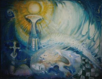 | Collezione "Walking Arts" New York. IL RE DEL GRAAL FERITO, dipinto della Principessa Rosemarie Macedonio d'Aragona Avril de Burey d'Anjou Hohenstaufen Puoti von Comneno Canmore Plantagenets. Il quadro fa parte del Ciclo "La Quete du Gral" . | ||||||||||||||||||||||||||||