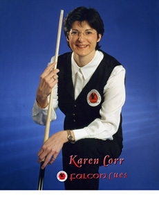 Karen Corr Professional Pocket Billiards World's #1 Rated Female Player BCA Open Champion 2002 WPBA National Champion - 2001 Player of the Year - 2001 Sportsperson of the Year - 2001 Silver Medalist - 2001 World Games Runner-up WPA World Championships All Japan Champion - 1999 Winner of 12 Major Titles Since first playing in the United States in 1998, Karen Corr has skyrocketed up the rankings of the Women's Professional Billiard Association (WPBA) by becoming the third best player in her sport in just two short years. After 3 years, she became the Number One in the World. Described by her peers as "an extraordinary talent," "a very positive role model," "a fierce competitor who makes friends as well as fans wherever she goes," Karen has been playing "in style" all over the world while winning countless championships. Karen immigrated to the United States from Ireland in June 1998 and began playing in WPBA sanctioned qualifying tournaments to earn an entry spot on the WPBA Classic 9-Ball Tour. After winning an unparalleled ten consecutive qualifying events in a row, Karen was eligible to participate in enough WPBA events to earn her Touring Pro status and guaranteed automatic entry into WPBA events. She competed in her first WPBA event, which took place in New York in August 1998. She finished seventh place in that event and since then has only improved her game. Karen was named Billiard Digest Rookie of the Year in 1999. She captured Northeast Woman's Tour Player of the Year honors in 1998 and 1999 where she also ranked number one on the Northeast Women's tour. Before she moved to the United States, Karen was already winning tournaments in the United Kingdom and has 30 major snooker titles under her belt. She was the World Snooker Champion in 1990, 1991, and 1995 - 1997. She earned the title of World English Billiards Champion in 1998 and 1999 as well as European Snooker Champion in 1998. She was ranked number one in World Snooker tournament play from 1994 - 1998. Karen was also Tournament Champion at Valley Forge Super Billiards Expo 2000 and has won 17 non-ranked WPBA events. Karen was the first woman qualified through the World Snooker Association to coach snooker and has also had extensive sports telecasting experience in the UK, India and Australia. Karen's goal is to become the #1 9-ball player in the world. With five World Snooker Championships and two World English Billiards Championships amongst her list of achievements, this goal is well within her sights. With her vigorous practice schedule, that includes four hours a day at the table, Karen will undoubtedly remain a familiar face on the WPBA Classic 9-Ball Tour for many years to come.