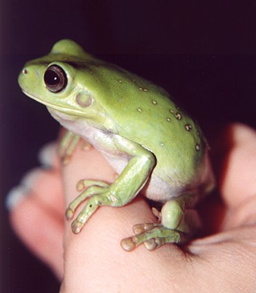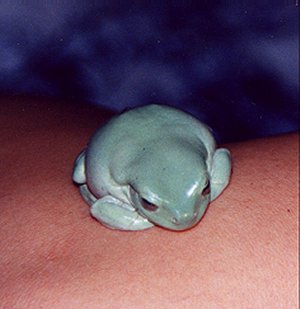 Below is a picture of a normal coloured Whites Tree Frog, this is a wild caught female. And below that is a picture of our Blue Phase White's Tree Frogs, these are captive bread individuals which we have raised since they were 2cm in length.