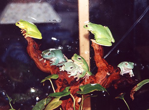 These are our group of White's Tree Frogs (Litoria caerulea) and White-Lipped Tree Frogs (Litoria infrafrenata). Although it may not be obvious in this picture, the Whites are blue phase. Blue animals can arise spontaneously in a population through a mutation which eliminates yellow pigment in the skin (blue and yellow makes green - remember). Unfortunately, most of the really good blue mutants are due to non heritable mutations (I am sure that many of you have seen pictures of the perfect blue coloured Green Tree Frog. After many crosses and the production of an F2 generation, that wonderful blue colouration has yet to reappear). In the White's Tree Frog, there are lines of frogs which have blue colouration, although it is not quite as distinct as some of the other mutations, these animals are a very nice blue colour.