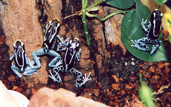Above is our group of Powder Blue Dendrobates tinctorius. These are beautiful frogs which are quite large and can be very bold once they get used to you, and if the humidity is kept high enough. They have no problem coming up to the glass to feed on fruit flies right in front of you.