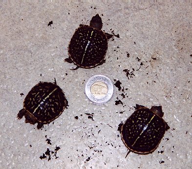 Below is a picture of our baby Ornate Box Turtles (Terrapene ornata). These are really cute little guys (the coin between them is a Toonie [about the size of a 50cent piece in the States]). We also have Eastern Box Turtles (Terrapene carolina carolina), a pair of adult Ornate Box Turtles, and a group of Red Eared Sliders (Trachemys scripta) which were abandoned by their owners (as most adult Red Eared Sliders are). More pictures are to come of the Turtles, but go and see our Tortoises at the link below.