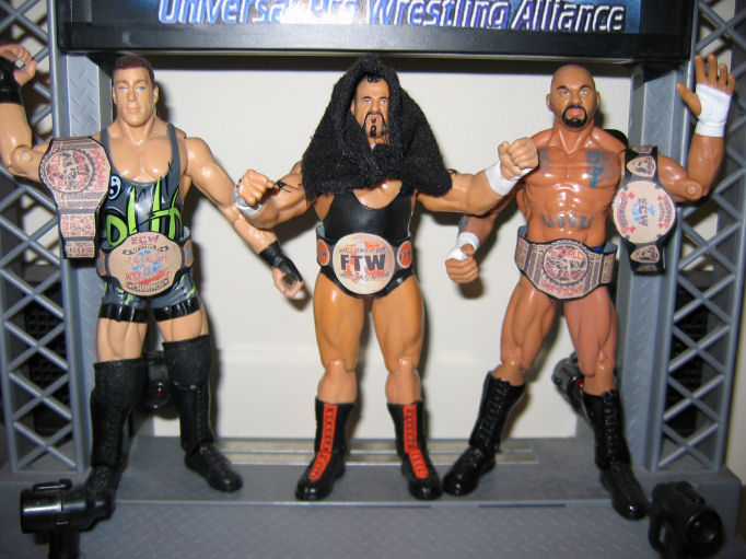 | Rob Van Dam: ECW World Title (Waist), ECW Tag Team Title (Right Shoulder) Taz: ECW FTW World Title (Waist) Perry Saturn: ECW Tag Team Title (Waist), ECW Television Title (Left Shoulder) |