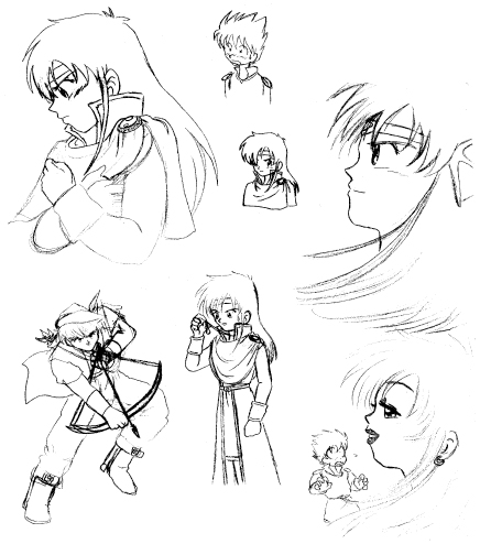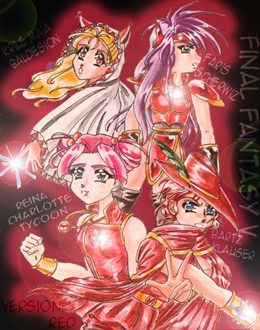 |  Yet another collage of some sketches done by Kim. The main characters at the bottom were the very first FF5 drawings she has ever made, but were hidden away til now. Made by Kim. |