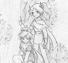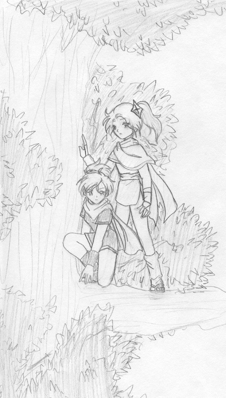 I nice pencil sketch of Krile and Reina watching from the treetops as Ninjas. Made by Kim. |  |