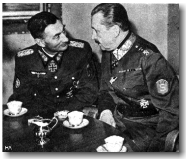 | New commander of AOK Lappland General der Gebirgstruppen Eduard Dietl (left) is discussing with Finnish C-in-C Marshal G. Mannerheim in winter 1942. Dietl was very liked among the Finns and his subordinates because of his great sense of humour and spontaneity. (Photo: Harri Anttonen, scanned from Hakkapeliitta magazine No. 22 / 1942) |