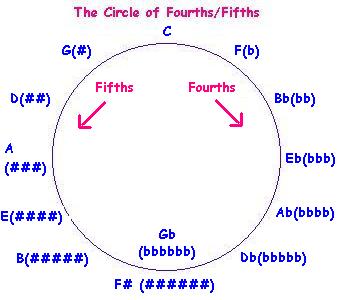 | Major Scales To play a major scale, start on the note it is named for, then go up and down the scale in the key signature. Example: F major scale starts on F, and the key signature is one flat (Bb). So, the scale is F, G, A, Bb, C, D, E, F, E, D, C, Bb, A, G, F. Q: How do I figure out the key signature of a major scale? A: By refering to the circle of fourths/fifths, which is the reference guide for all scales. It shows the scales in a circle, by key signatures. The circle gets its name because to move around the circle clockwise, you are moving in intervals of a fourth, and if you go counter-clockwise, you are moving in intervals of a fifth. This is a picture of the circle: |